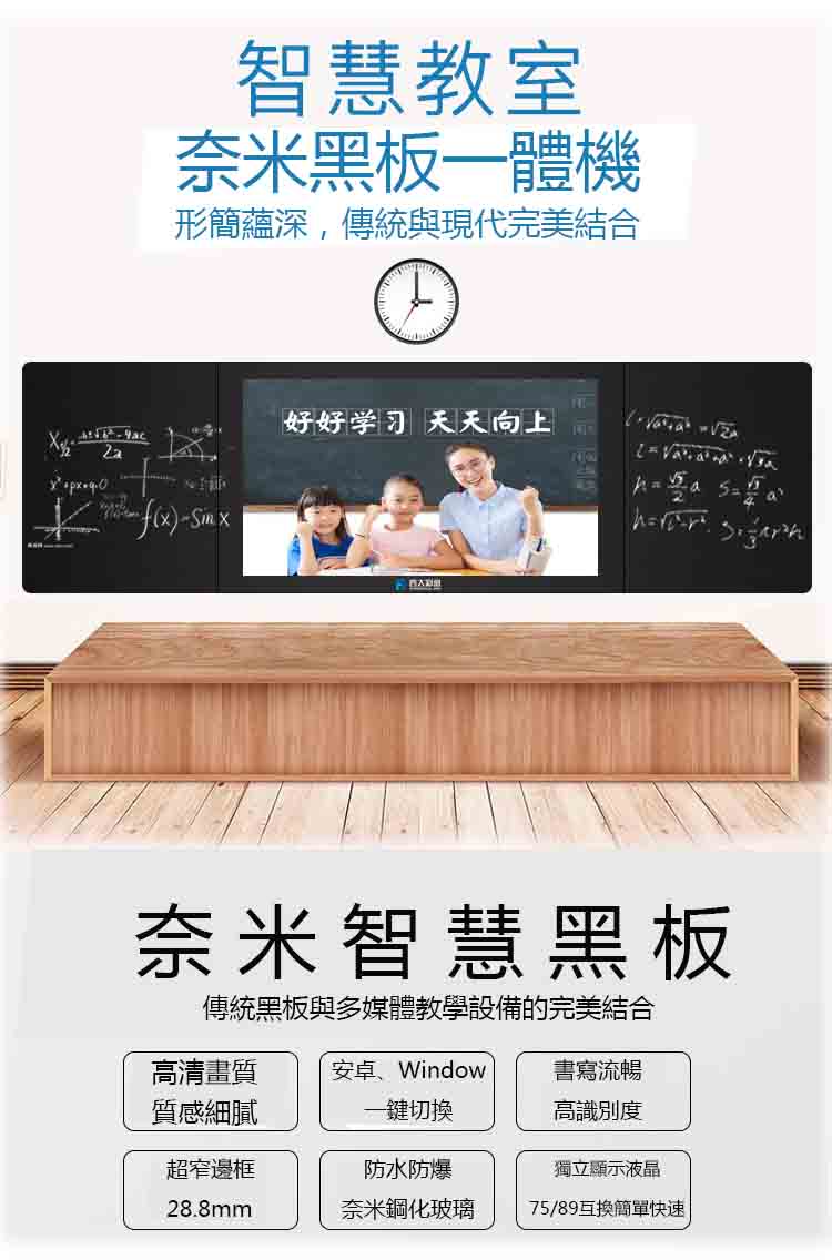 智慧奈米黑板顯示屏是一種新型的電子顯示屏,其主要特點是採用了奈米級別的塗層和材料技術,可以實現更加精細的圖像和更高的亮度、對比度和色彩飽和度。智慧奈米黑板顯示屏通常具有以下優點: