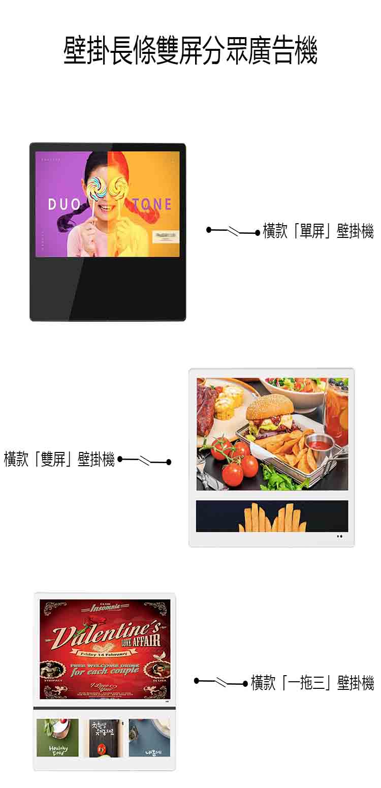 分屏壁掛超薄電梯廣告機通常採用 LED 或 LCD 技術,具有高亮度、高對比度和高清晰度等特點,使得廣告內容可以在光線暗淡的環境下仍然清晰可見。它可以同時顯示多個廣告內容,通過分屏設計可以讓不同的廣告內容在同一屏幕上呈現,達到更好的廣告投放效果。
