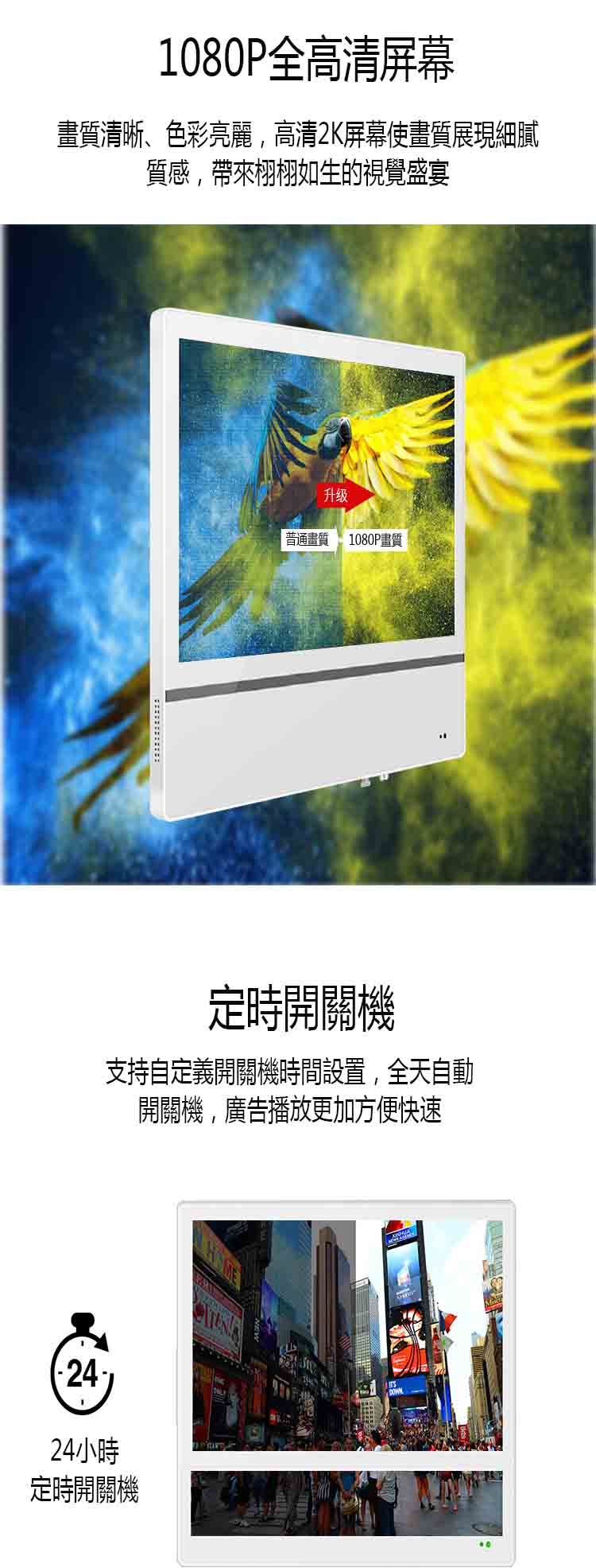 分屏壁掛超薄電梯廣告機還可以通過網絡或 USB 介面進行廣告內容的更新和管理,從而實現遠程管理和控製。它還具有多種顯示模式,例如定時顯示、隨機顯示、輪播顯示等,以滿足不同的廣告展示需求。